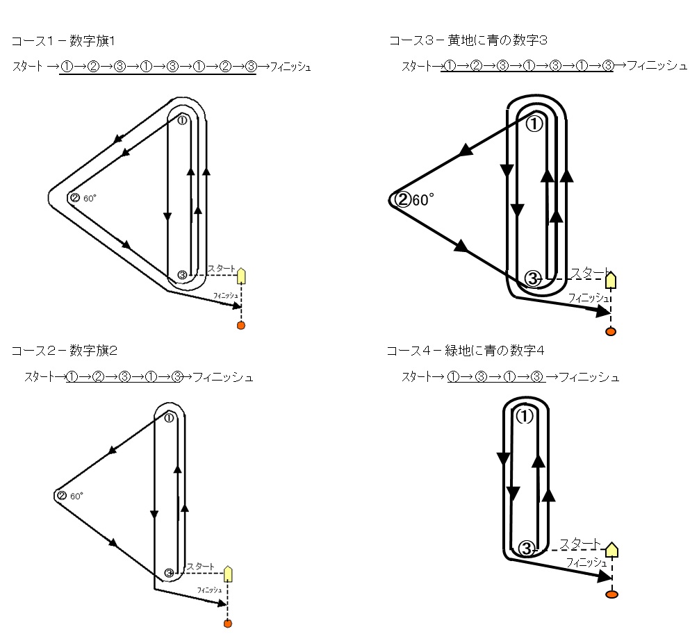 マーク1、2は黄色の棒状レガッタブイ、マーク3、FINISHマークはオレンジ色の球形ブイである。