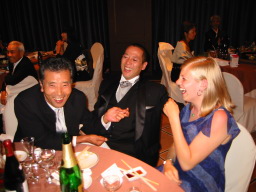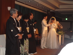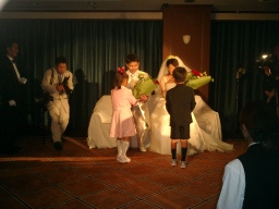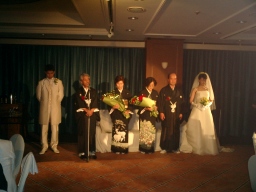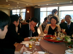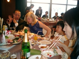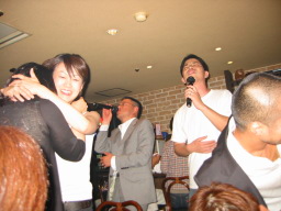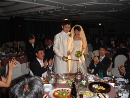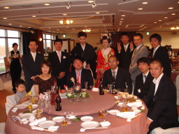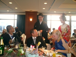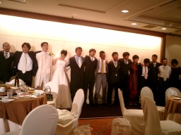 | 新郎の勤める会社の社長、SPC工法よろしく! なかなかの女好きとみた! 振り向くと盛り上がっております(笑) 自称38歳の青年社長だそうです。 |