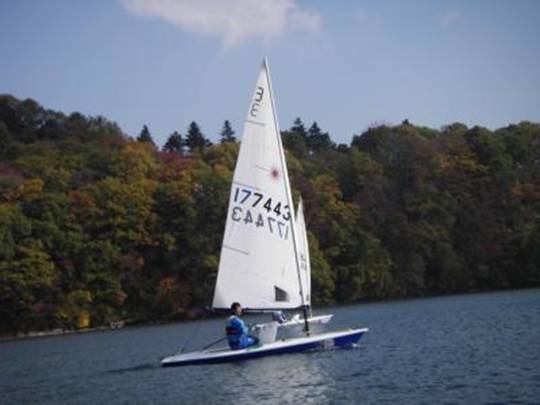 我々もリコールナンバーをニューセールに貼り付けて、さっさと計測を済まして海面チェック。ナショナルチームはちゃんと右左に分かれて走り比べをしています。我々は昨年の北信越選手権で野尻湖はわかっている(つもり)なので、安易に北風なら左、南なら右に突っ込みを決定!