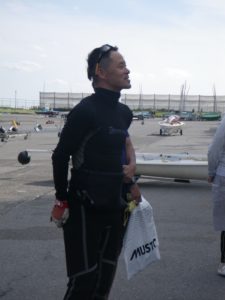 !!2位は、国体予選に向け久々にLaserに乗ったモス乗りの大西選手。MarkⅡセイルの扱いに慣れず最初は出遅れましたが、その後はしっかりチューニングしてTopを激走していました。3位は花田選手がしっかり付いて行ってました。