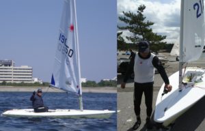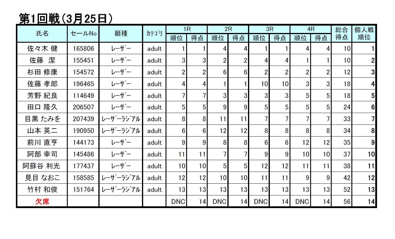海上に出てスタート予告時刻になっても西風ながら定まらず回答旗掲揚!その後、北北西方面からようやくブローが入って来たので、マークをくるりと打ち変え第1Rスタート。第2Rも同様の風軸で行いますが、みなさんスタートから団子状態で抜きつ抜かれつのレース展開。第3Rでは、下スタ有利でスタートしますが、その後大きく左に振れ、上マークまでクローズリーチのレース。逆にサイドマークへは、クローズホールド。そんな状況下、下マークを回航したTop集団が、マークを間違え仮想上マーク(サイドマーク)に向かって上り始めます。早めに気がついた佐々木選手は、Topで走りきりましたが、佐藤潔選手は4位まで順位を落としました。