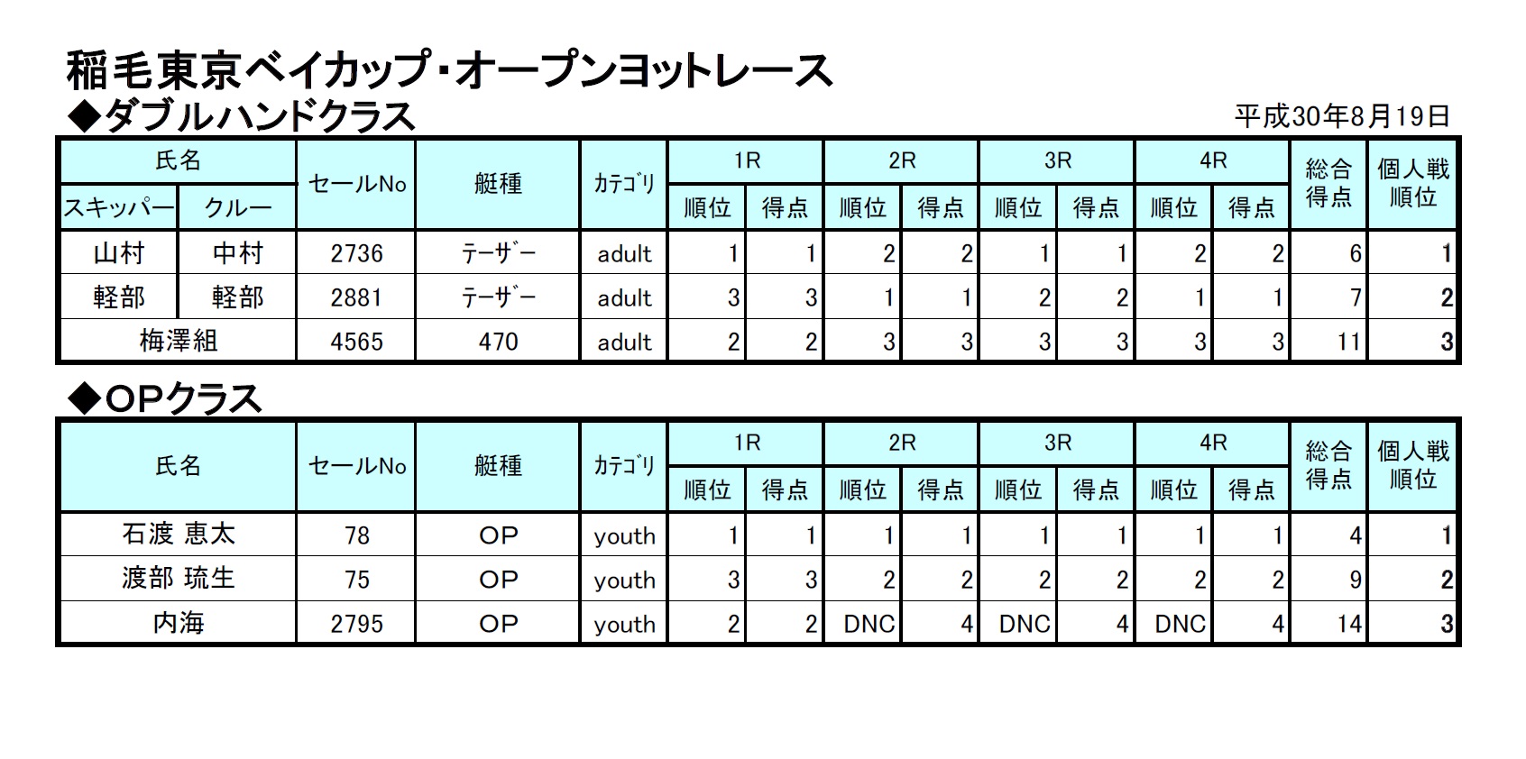 ダブルハンドは、大学生の中村君をクルーにした山村・中村組が優勝。OPは石渡君がオールTopの快走をしました。