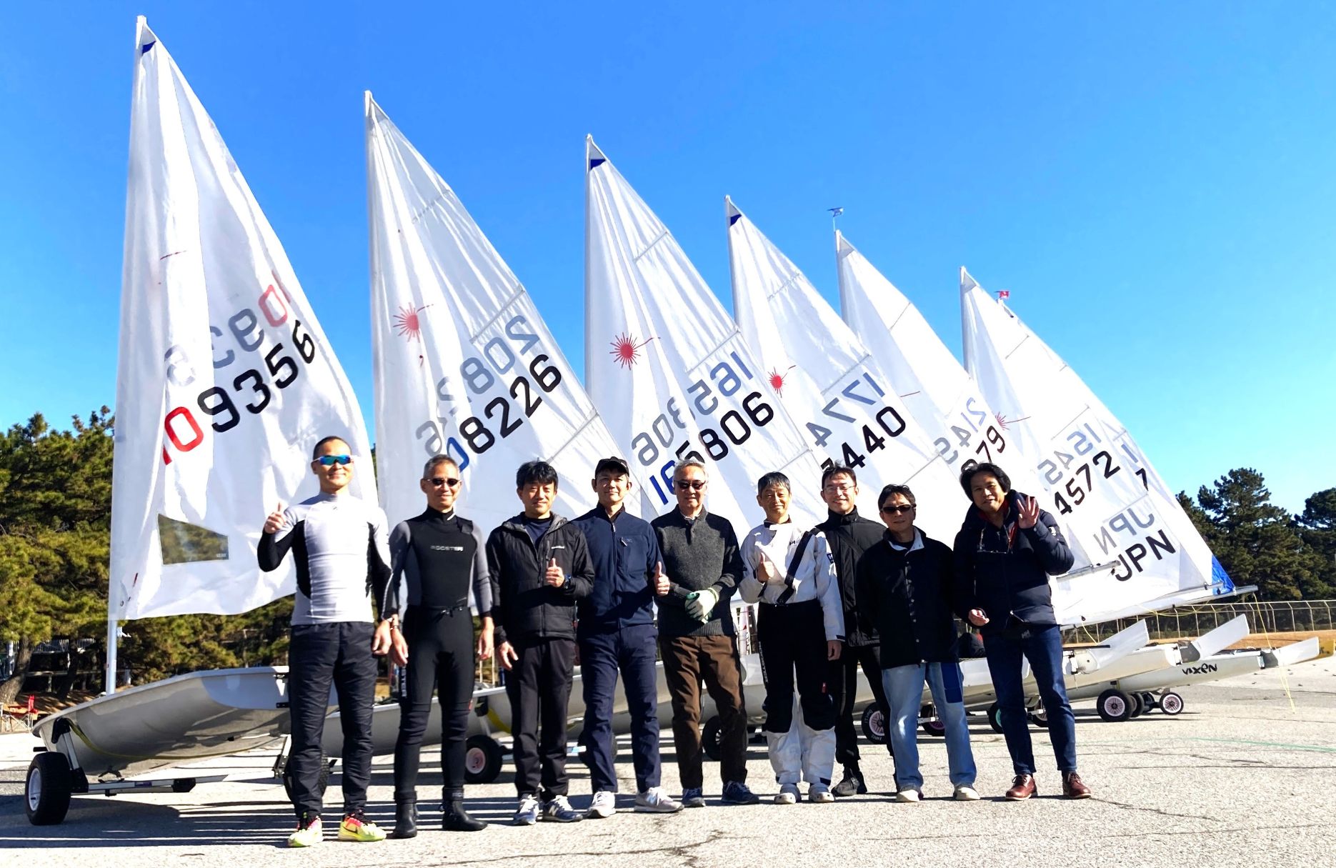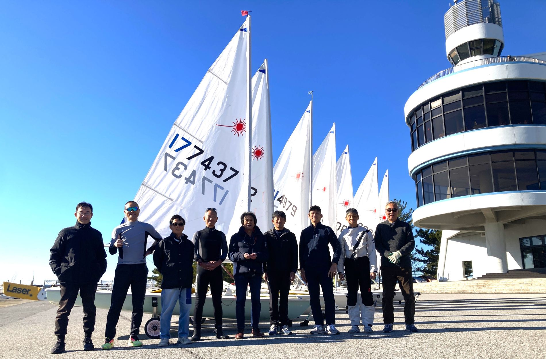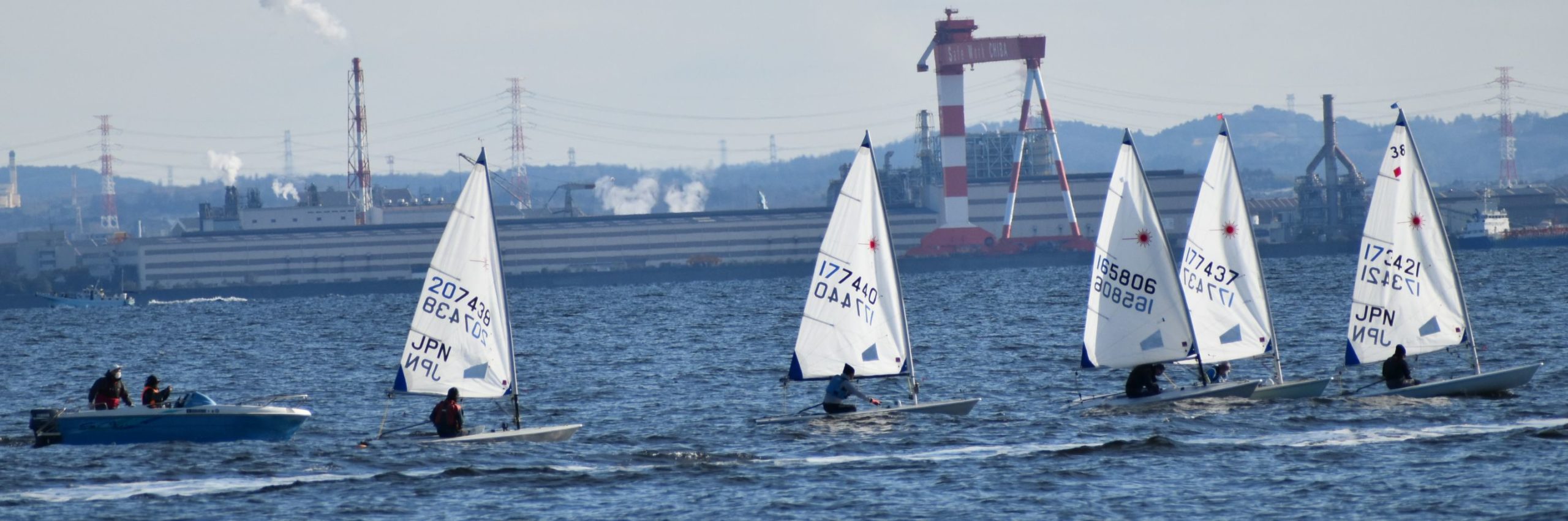 ポンド内で早速ウォームアップのサークリングを行います。時に吹き付けるブローと激しい風の振れに何度もブームで頭を打ちながら、だんだん身体も温まってきたところ、桟橋でメガホンを握る荒井さんから、微速前進からクローズスタートをするよう指示。ハーバー内でフルハイクに出るタイミングでバングシートを引き込む所作に熱中するあまり、T氏が桟橋のクリートにメインシートを引っかけて立ち往生、陸のメンバーに助けてもらう珍場面も飛び出しました。