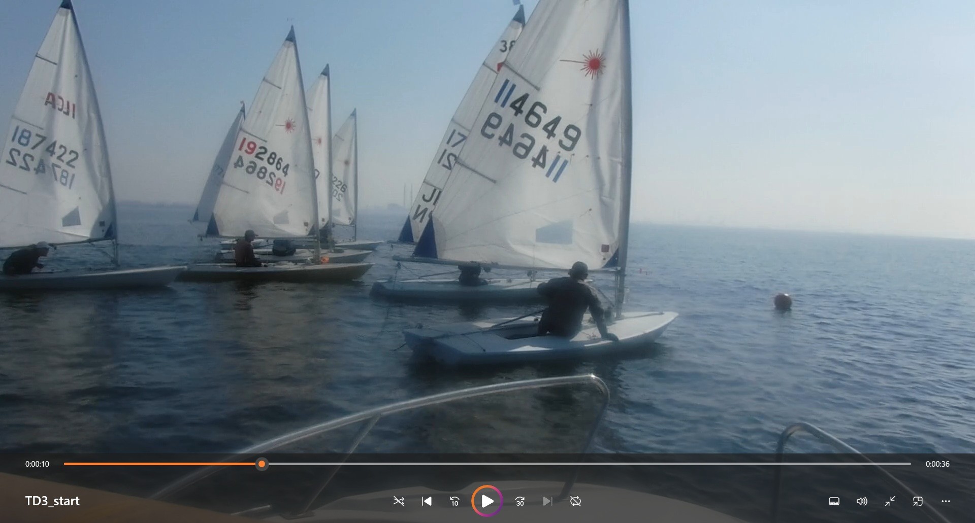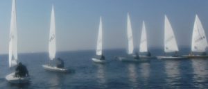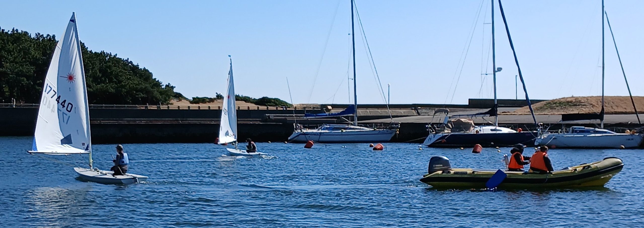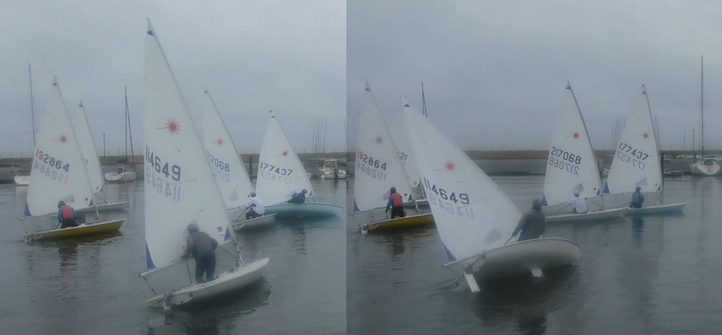 ポンド内で早速ウォームアップのサークリングを行います。時に吹き付けるブローと激しい風の振れに何度もブームで頭を打ちながら、だんだん身体も温まってきたところ、桟橋でメガホンを握る荒井さんから、微速前進からクローズスタートをするよう指示。ハーバー内でフルハイクに出るタイミングでバングシートを引き込む所作に熱中するあまり、T氏が桟橋のクリートにメインシートを引っかけて立ち往生、陸のメンバーに助けてもらう珍場面も飛び出しました。