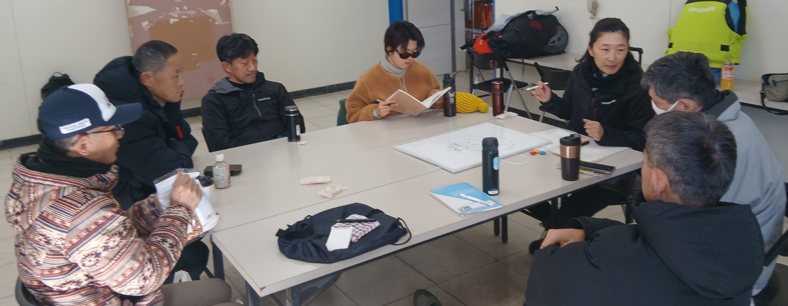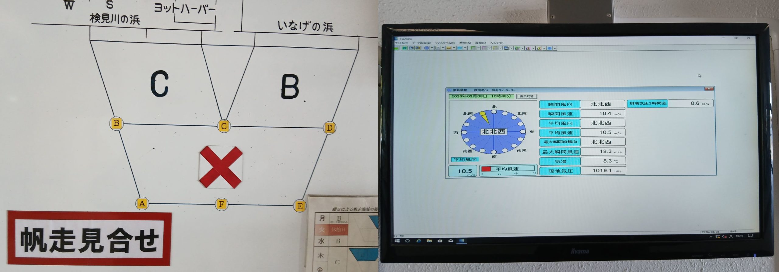 今期最後となる3月第2週末に開催された荒井塾は、春特有の足の速い低気圧通過と冬型気圧配置の影響を受ける海況を考慮して土日どちらの開催とするか参加者も含めてぎりぎりまで検討しました。最終的に3月8日(日)開催と決めた朝、北寄りのやや強い風が吹く中この天気で乗るの?と訝しむ家族の声を背中にとにかく稲毛へと向かいました。ハーバーに着くと案の定、帆走見合わせの赤旗がひらめき風速計は瞬間最大風速18m/sを記録、沖には白波が覆い、さすがに即時の出艇は無理で、荒井さんを囲んだ6名のTBFメンバーは建屋内で様子を見ることになりました。今期3度目となった座学では、主にダウンウインド時の留意点などについてレクチャーがあり、メンバーの不用意な(?) 発言への荒井さんの鋭い突っ込みが笑いを誘うなど、質疑応答も含めて和気あいあいとした雰囲気で午前中が過ぎました。