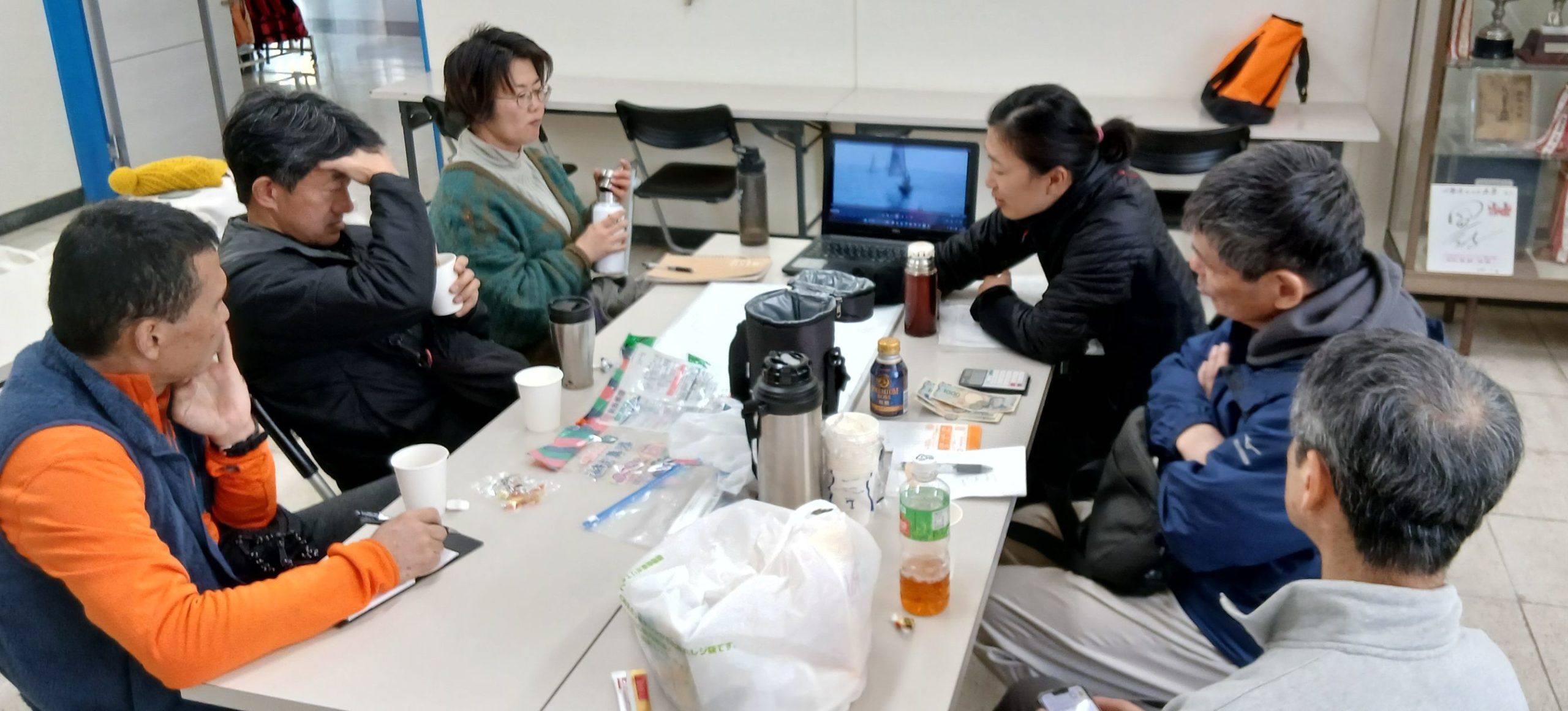 狭いながらもギャラリー(?) に見守られて何回か所作を繰り返して小一時間、帆走見合わせが解除される見通しが立たないこともありポンド内練習は切り上げたあと、陸でI氏心づくしのショウガ茶で身も心も温まりました。