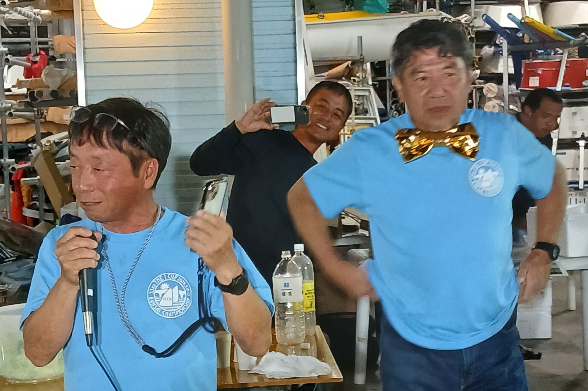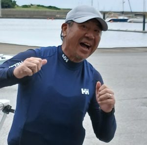 さて、この時点で私と佐藤潔選手が同点となり、最終R次第で優勝が決まるという展開で、気合を入れ直しスタート。これまた良いスタートを切った私でしたが、横山選手が右海面に展開し、佐藤潔選手が左海面に展開する流れとなり、3人の選手でTOP争いをする我々ジジイにとってはご褒美?!と思うくらい、脳汁出まくりで大興奮する大接戦となりました(いやー、楽しかった!)。で、左海面で展開していた潔選手が伸びてきたので、慌てて寄せていったのですが、「ヤバイ!前をきられる!」と思い、下受けタックでミートを回避しました。するとだんだん「お!ヘダやで!」と私に有利に風がシフトして、セーフティな差をつけて2上を回航し、下りで少し迫られるもそのままTOPフィニッシュして、平尾選手が今回栄えある優勝をGETしたのでした!