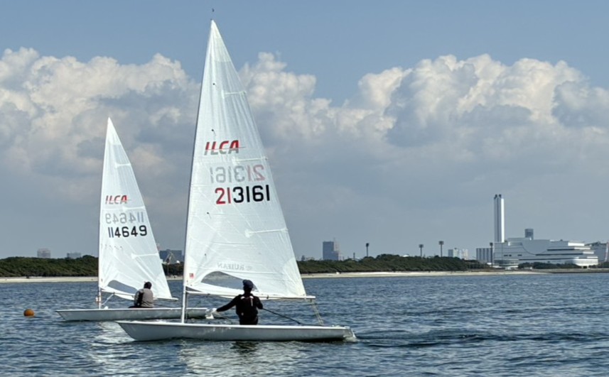 第1R、コース2でスタート。海面が広い土曜日のため上まで少し長めでしょうか。走ってみると、潮が右から左に流れていて、ポートロングで走らされます。