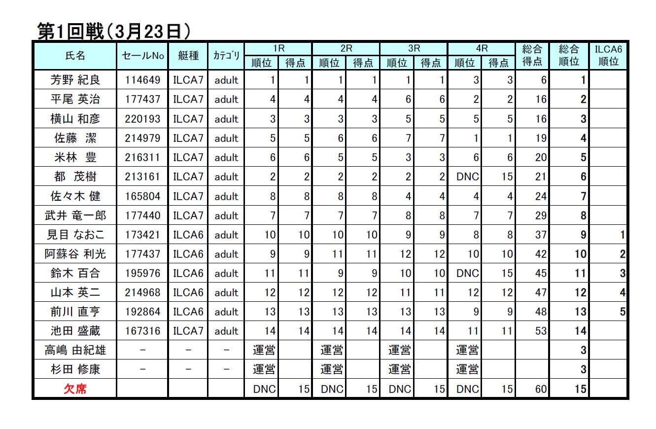結果、この日がニューボート(といっても6年くらい前の中古艇)の進水式かつ初レースだった芳野選手が、幸先良い開幕戦優勝となりました。滑りが良く、バウが出ていく感覚があり、荒井塾的にいうとフッティングモードが実践できていたのかもしれません。2位3位は、同点タイとなりましたが、意地で最終R2位に入った平尾選手が2位、安定して早かった横山選手が3位、Radial優勝は見目選手となりました。