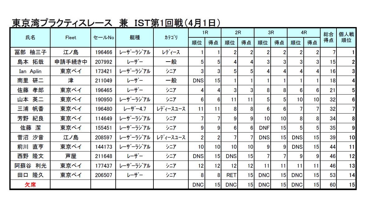 30度近い気温になった5/21(日)、第3回ISTが開催されました。マスターズ全日本前のためか13名が参加し、南西からの微風下で熱い戦いが繰り広げられました。