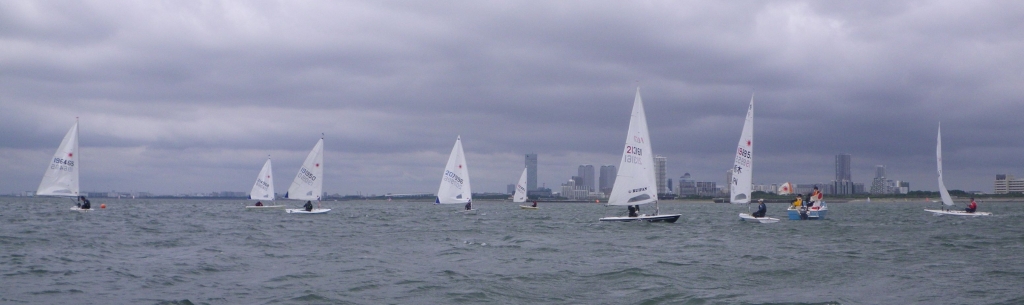初日、前日の風が朝のうち残りつつ出艇。風は落ちるとの予報通り、11時からのレースは、風待ちに… 風は無いわけではなく、吹いたと思えばすぐに消えてしまいます。12時前から12時半までは、海上でお昼休憩タイムをとりつつ、結局13時半まで待って第1Rスタート。ただし、あまりの微風でラジアルのTOP艇が上マークに到達するころ、N旗掲揚でノーレース。結局15時になってようやく東風6~8mの風が入り、スタートを試みますが、やる気が前に出過ぎてぜネリコが繰り返され、黒旗スタートへ!残念ながら5艇がブラックの餌食になりましたが、何とか1Rが成立し主催者側としてはホッとしました。
